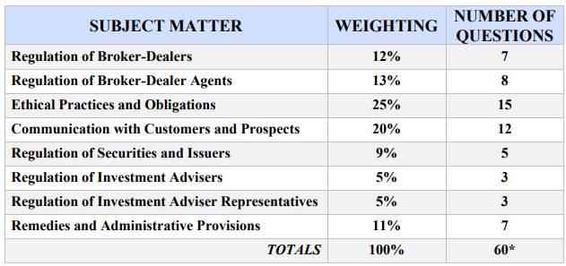 The Series 63 exam consists of 65 multiple-choice questions. Of these, 60 questions contribute to your score, while the remaining 5 are pre-test questions used to assess the validity of future exams. The pre-test questions are not scored, but they contribute to the development of the exam’s content and difficulty.